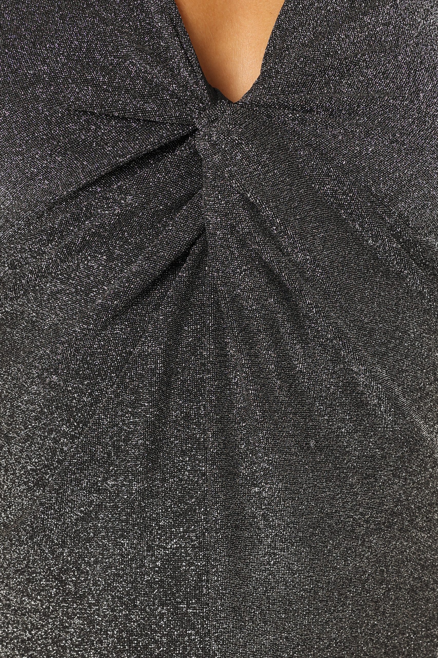 This beautiful maxi dress is perfect for any special occasion. The delicate v neckline with knot detail and long sleeves give the dress an elegant look. It features a unique back cut out detail that adds a touch of sophistication to the design.