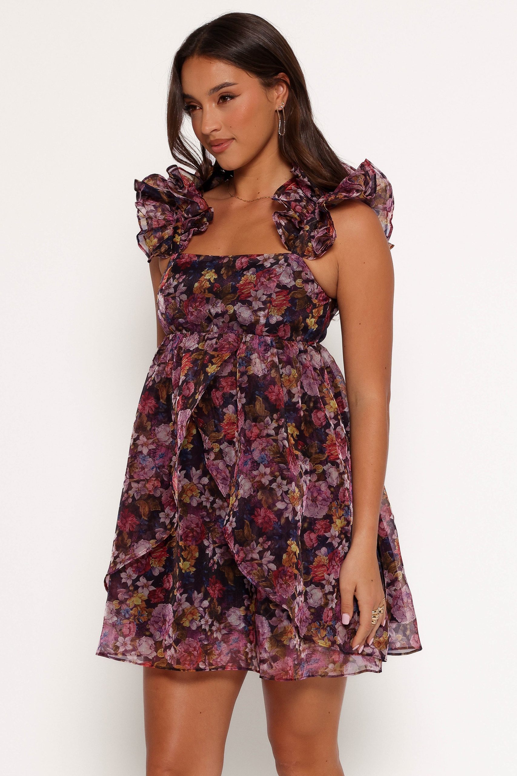 D ETAILS Introducing the Fiorella Mini Dress in Plum Floral???your new go-to for effortless elegance and playful charm. Imagine stepping out in this baby doll style dress. where the mini length offers just the right amount of fun.