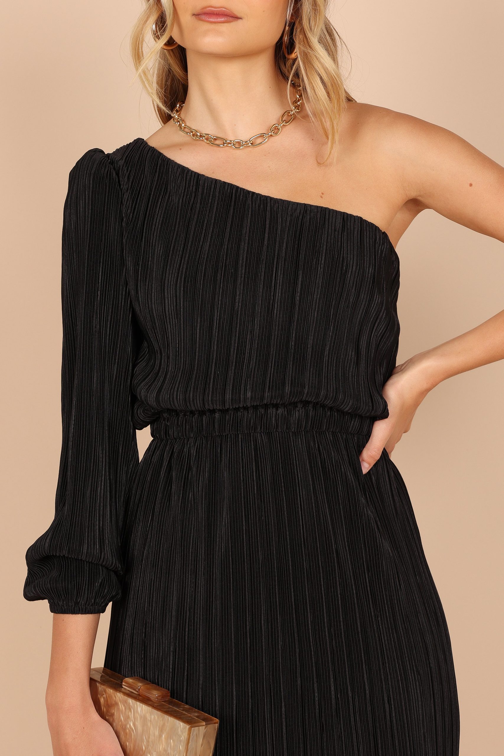 Choose a one shoulder style dress for the perfect balance of flirty and elegant. This midi length dress has an asymmetric neckline that’s sure to make a statement. while long sleeve with elasticised cuff adds drama to your silhouette. If you are in between sizes. we suggest selecting the size down due to the relaxed fit of this dress.