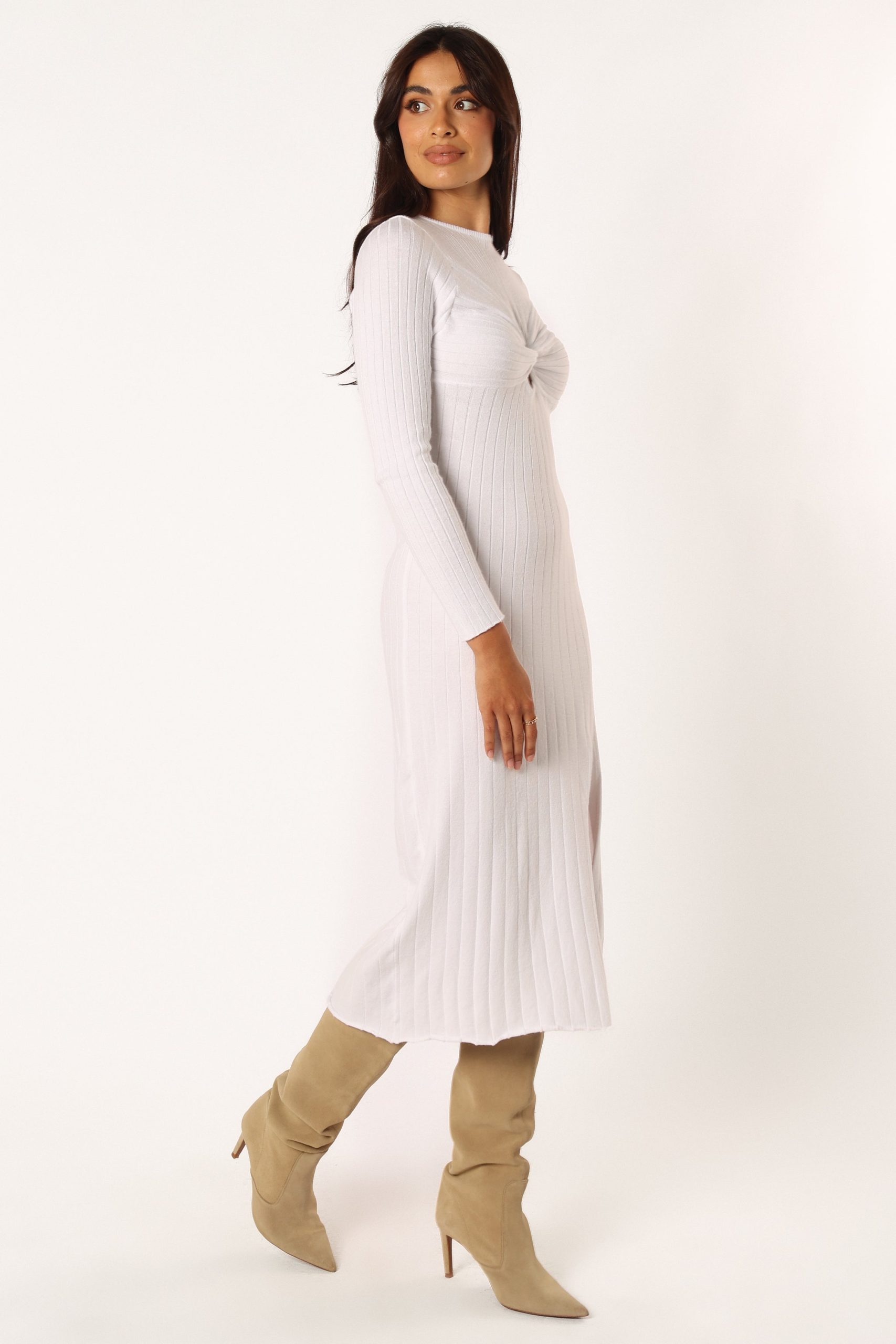 Fashion-forward and trendy. this midi length dress is an absolute must-have in your wardrobe. The high round neckline gives a sleek and sophisticated touch while the bust twist knot adds a playful element to the overall design.